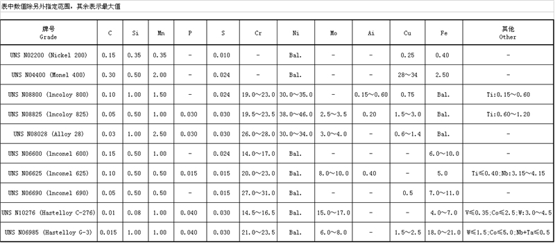 鎳基合金擁有較高的合金含量,如Cr、Ni、Mo等,在高溫、高腐蝕環(huán)境下仍然擁有良好的綜合性能,如:很強(qiáng)的抗酸、堿腐蝕能力;優(yōu)良的耐高溫腐蝕、應(yīng)力腐蝕性能;有的在還原介質(zhì)和氧化介質(zhì)中也有良好的耐蝕性。被廣泛應(yīng)用于火力發(fā)電的煙氣脫硫裝置,廢水處理;化學(xué)、石化、海洋開發(fā)工業(yè)中介質(zhì)腐蝕性強(qiáng)、環(huán)境惡劣的化學(xué)品生產(chǎn),加熱器、換熱器、蒸發(fā)器、冷凝器和輸送管線的制造;能源領(lǐng)域中的原子能發(fā)電,煤炭的綜合利用,海潮發(fā)電;海域環(huán)境的海洋構(gòu)造物,海水淡化,海水養(yǎng)殖,海水熱交換;食品領(lǐng)域的制鹽,醬油釀造等。